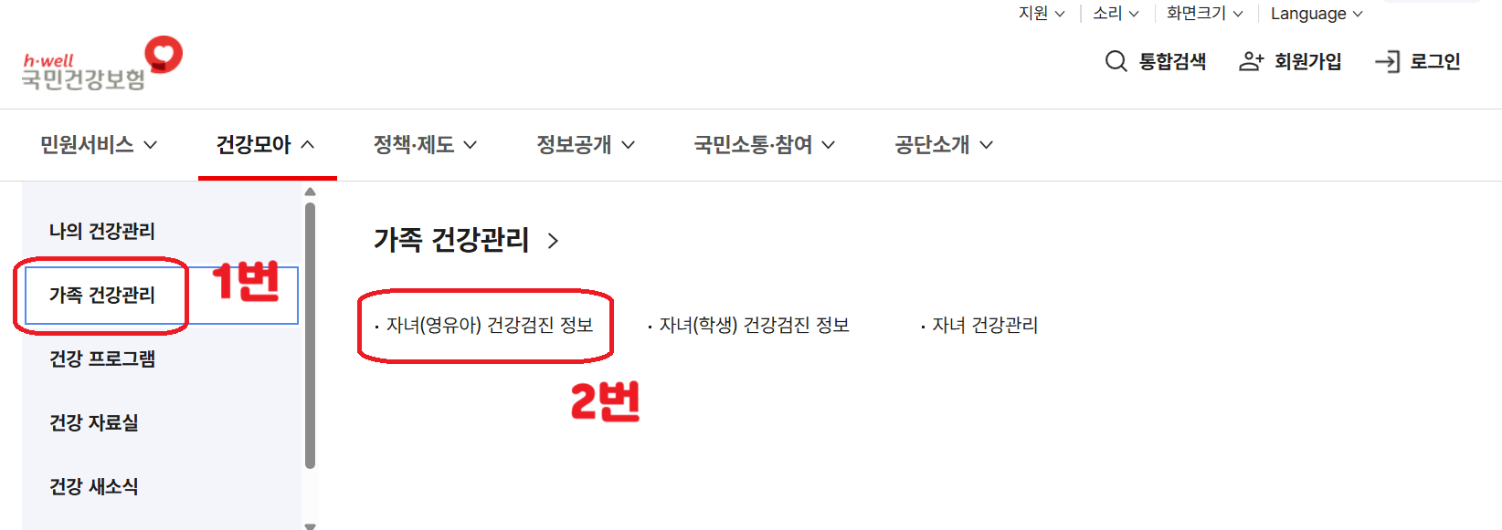 홈페이지 접속 후 로그인 > 건강모아 > 가족 건강관리 > 자녀(영유아) 건강검진 정보 > 검진대상 조회 /영유아 건강검진 결과 조회