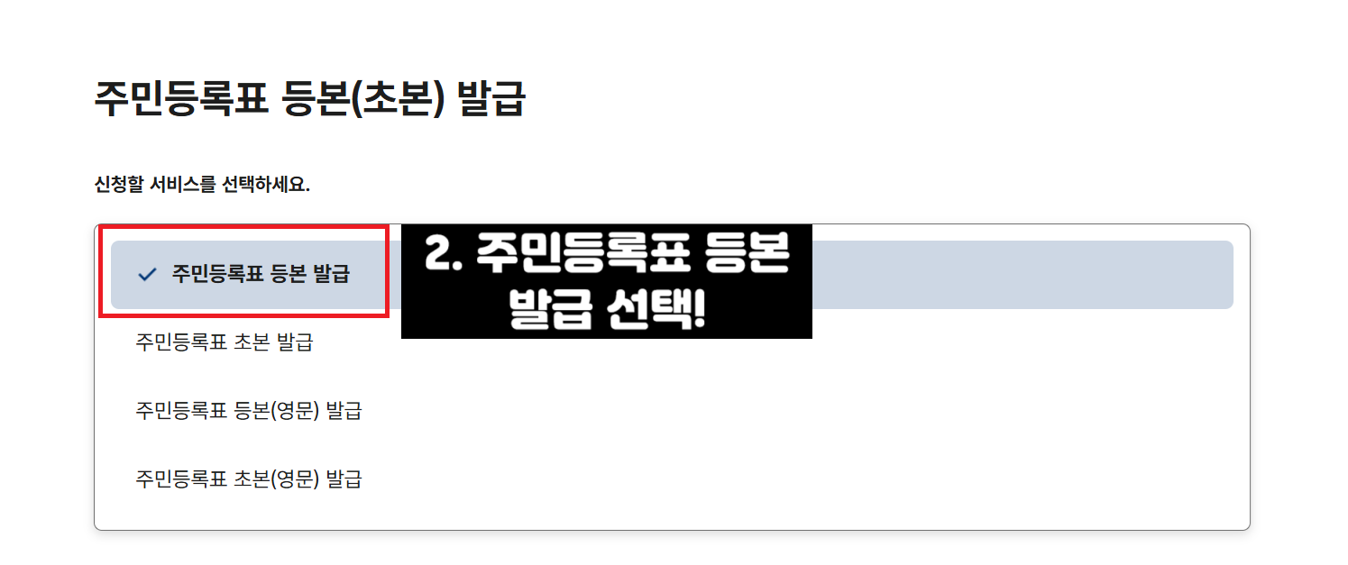 2️⃣ 주민등록표 등본 발급 선택 > 신청 내용 '주소지' 확인 및 '발급형태' 선택