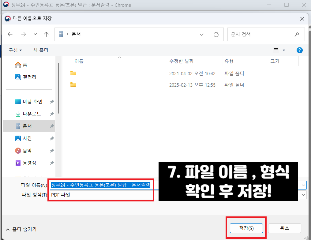 7️⃣ 파일 이름 / 파일 형식 PDF 파일 확인 후, '저장' 누르기!