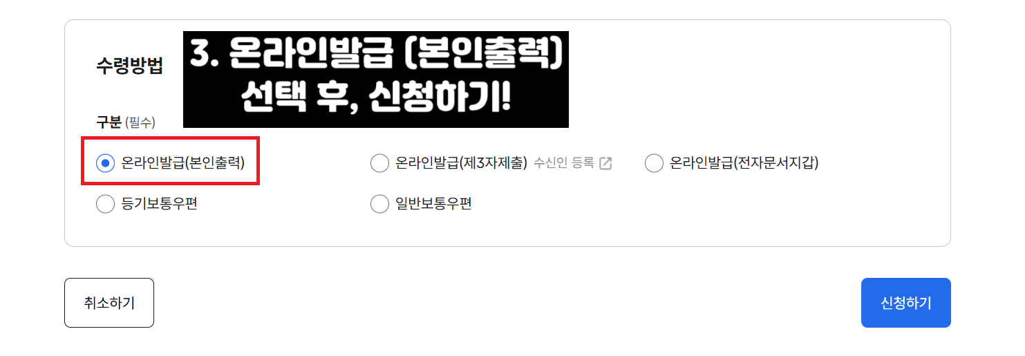 3️⃣ 수령방법 '온라인발급(본인출력)' 선택 후, 신청하기 클릭