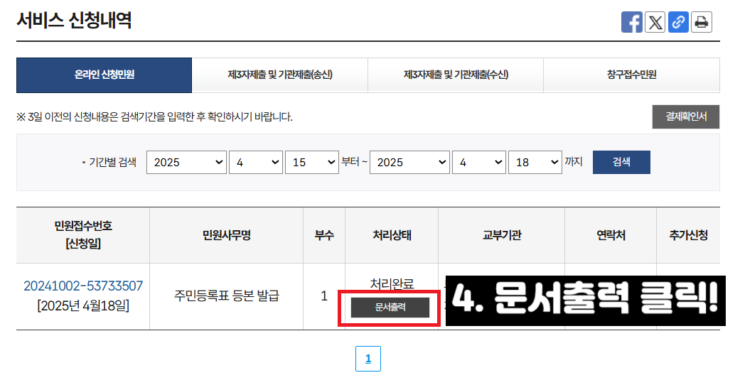 주민등록등본 인터넷 발급한 이력은 정부24 > 나의 민원 > 신청내역 조회 메뉴에서 확인할 수 있습니다. 발급 횟수도 제한이 있으니 관리가 필요해요.