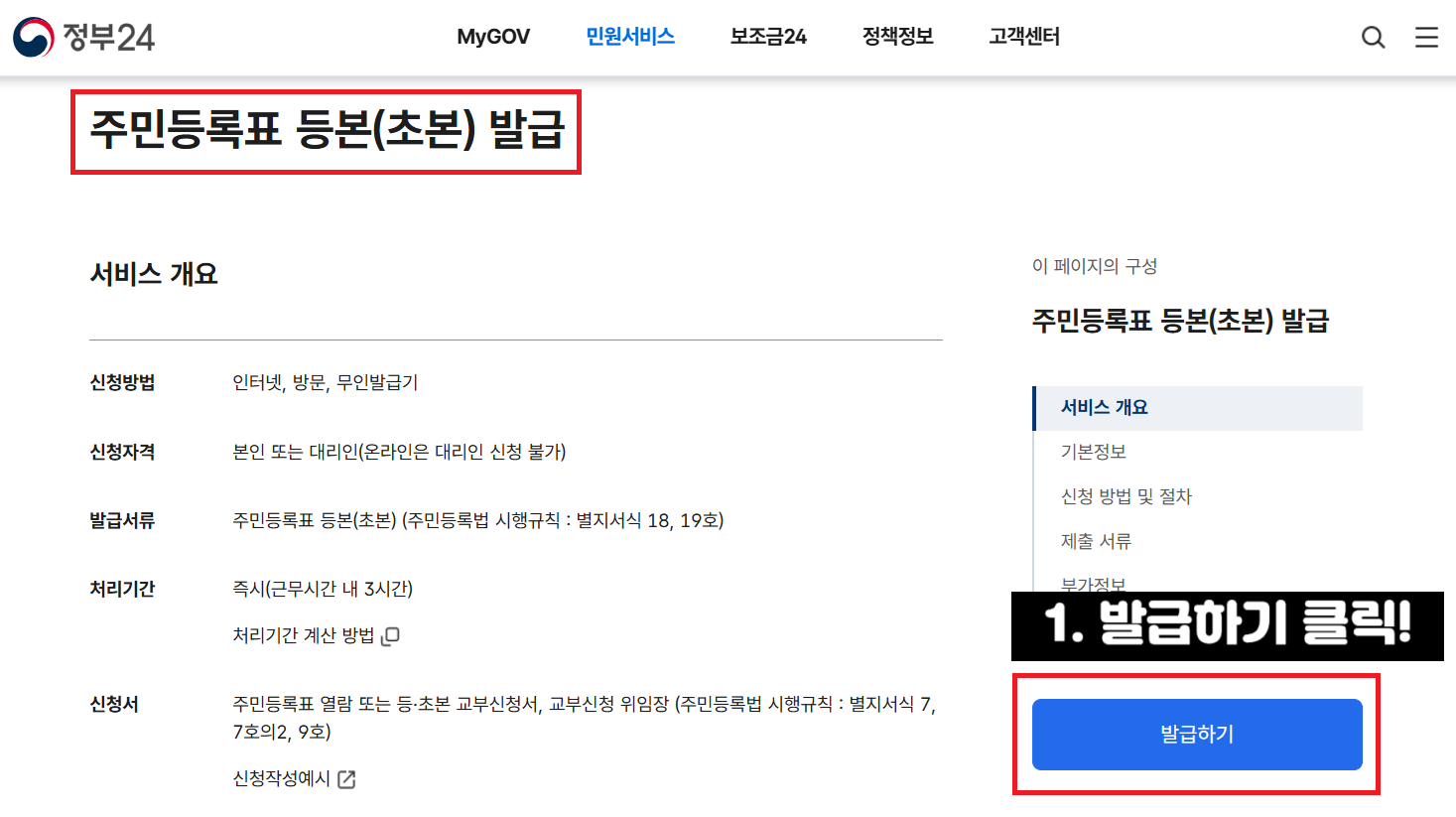 1️⃣ 정부24 접속 후 로그인 > 민원서비스 >민원 신청/안내 > '주민등록등본' 검색