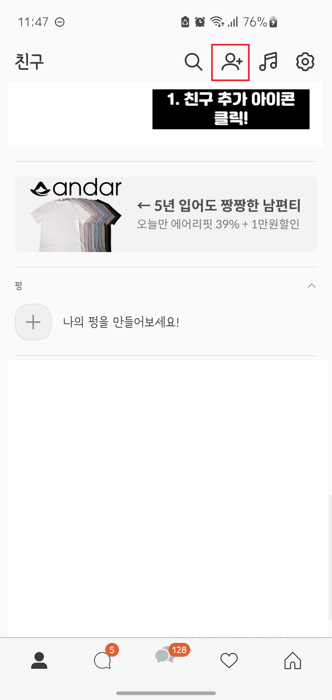 1) 카카오톡 '친구 추가' 모양 아이콘을 클릭하세요.