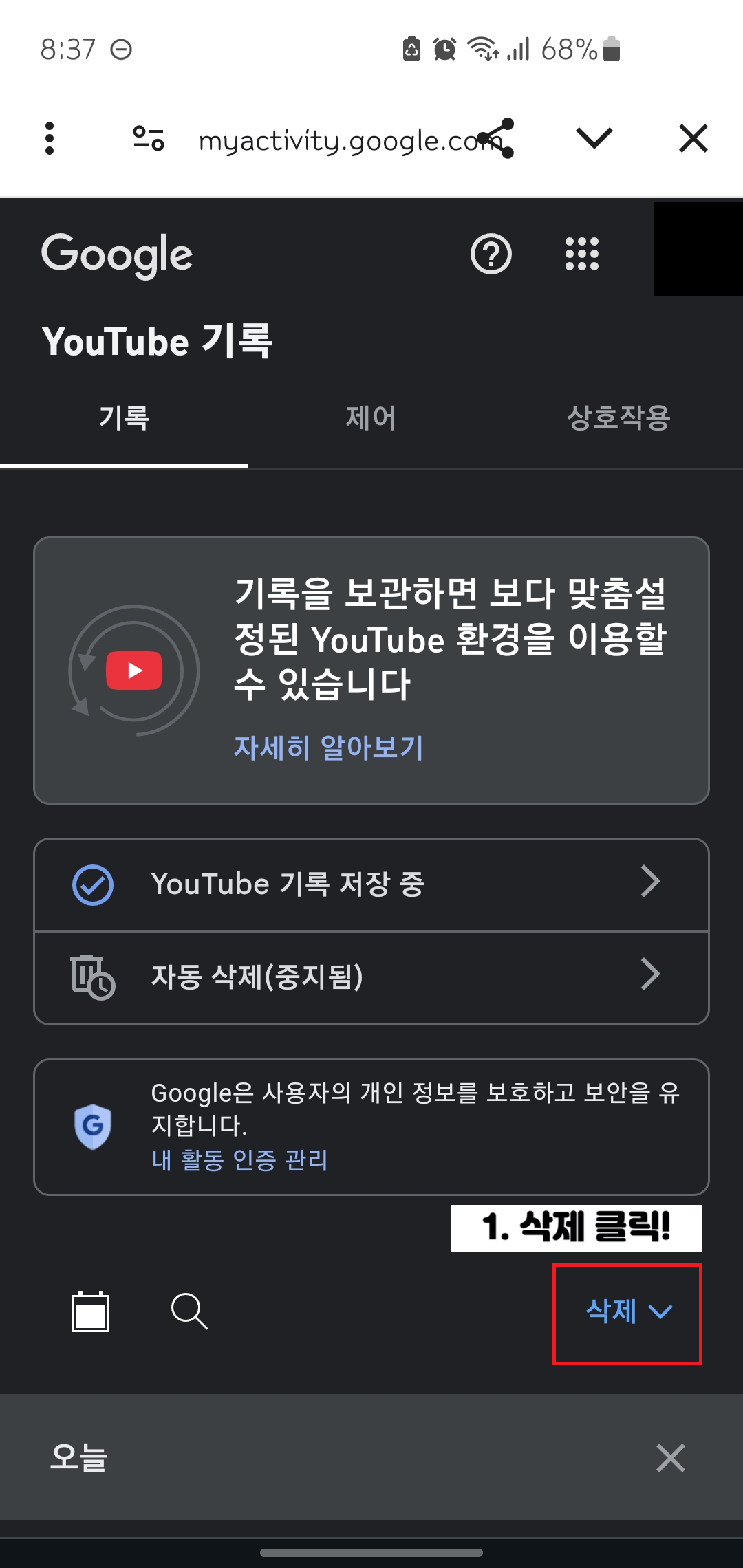 1. 유튜브 시청기록 사용중지 및 삭제